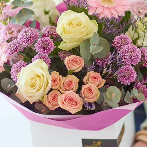 A bouquet of fresh, softly coloured pastel flowers expertly arranged by a local florist.
