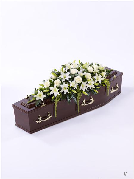 Beautiful Asiatic Lily and large-headed Rose in pure white are used to create this elegant casket spray. The fresh flowers are enhanced with trails of green amaranthus as well as ruscus, aralia leaves and eucalyptus. Approximate height 153cm (5ft).